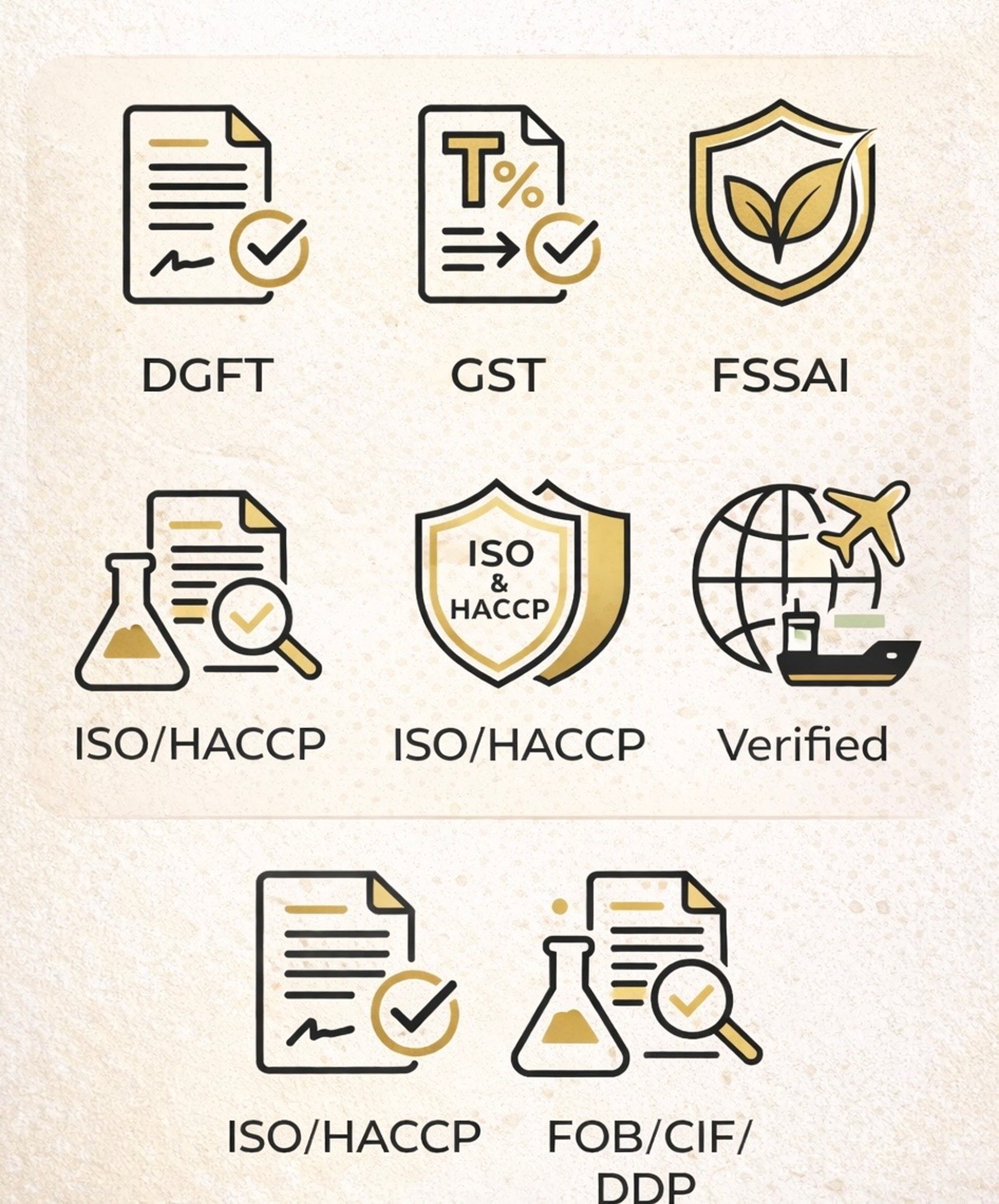 Products are sourced from ISO & HACCP-aligned manufacturing facilities. All food items are supplied with COA and export documentation as per international standards.